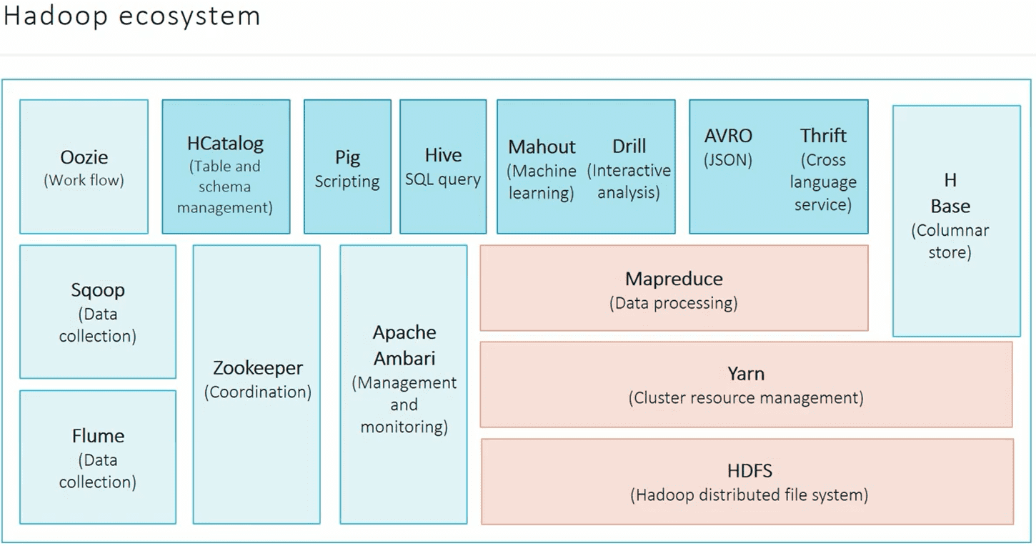 - Operations: Ambari, Cloudbreak, ZooKeeper, Scheduling, Oozie
