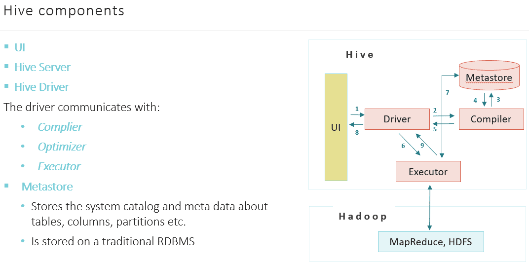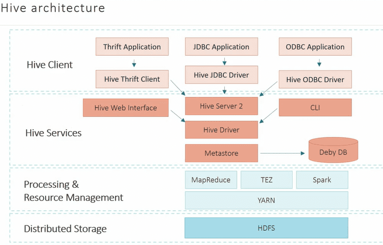 - Metastore DB: RDBS - MySQL, Oralce, Postgres, MS-SQL.